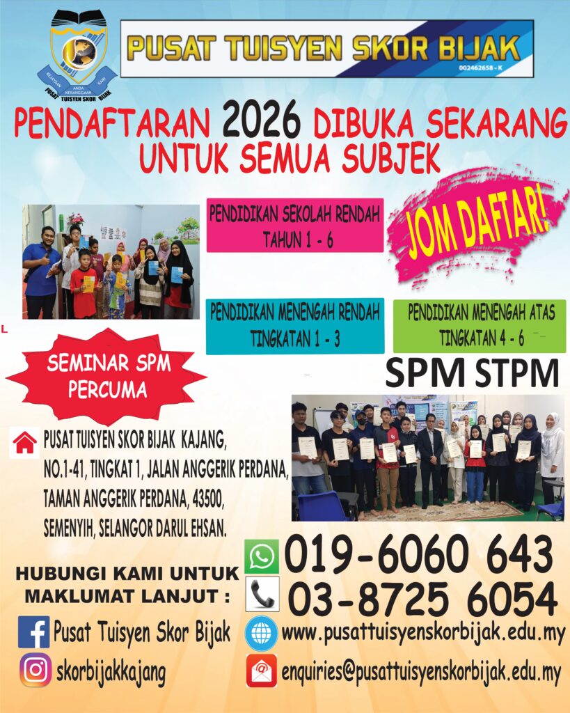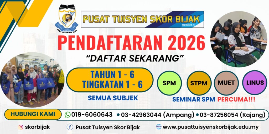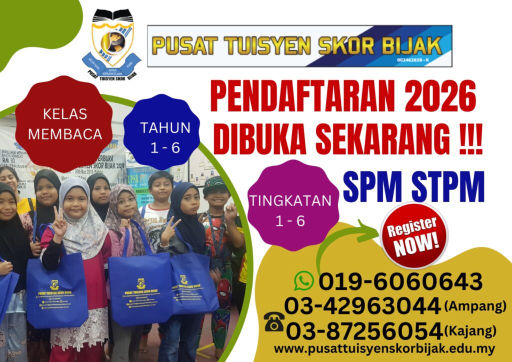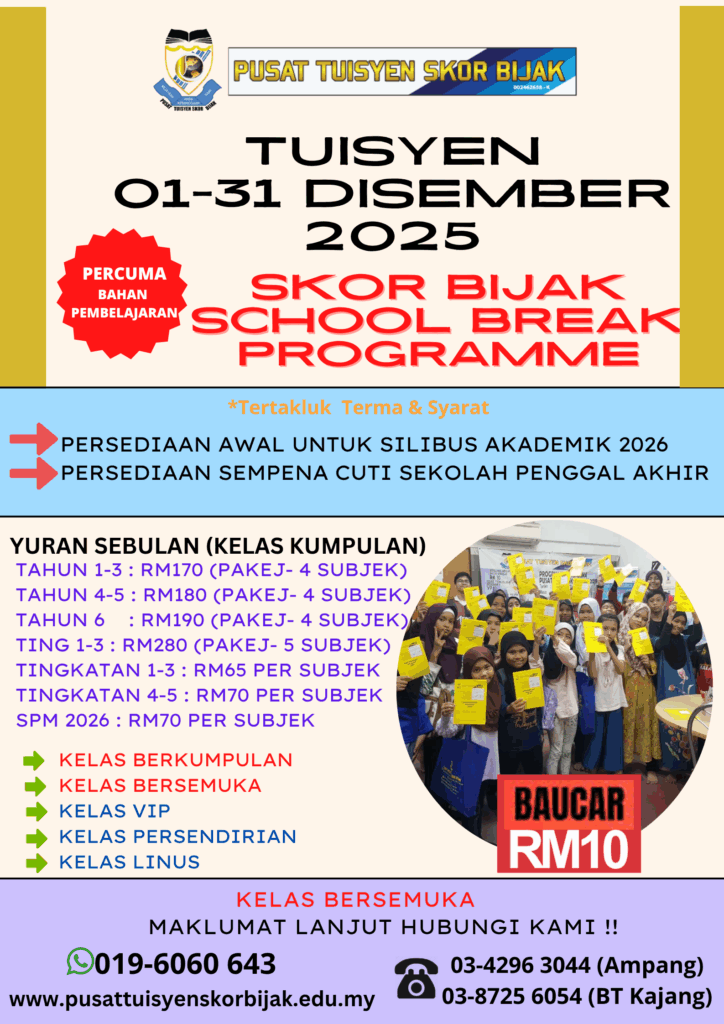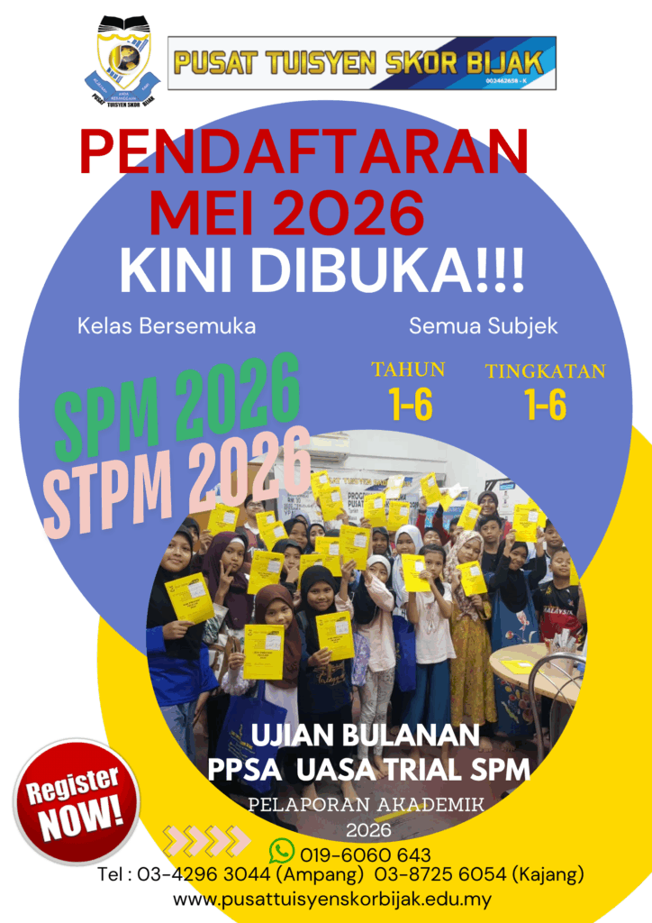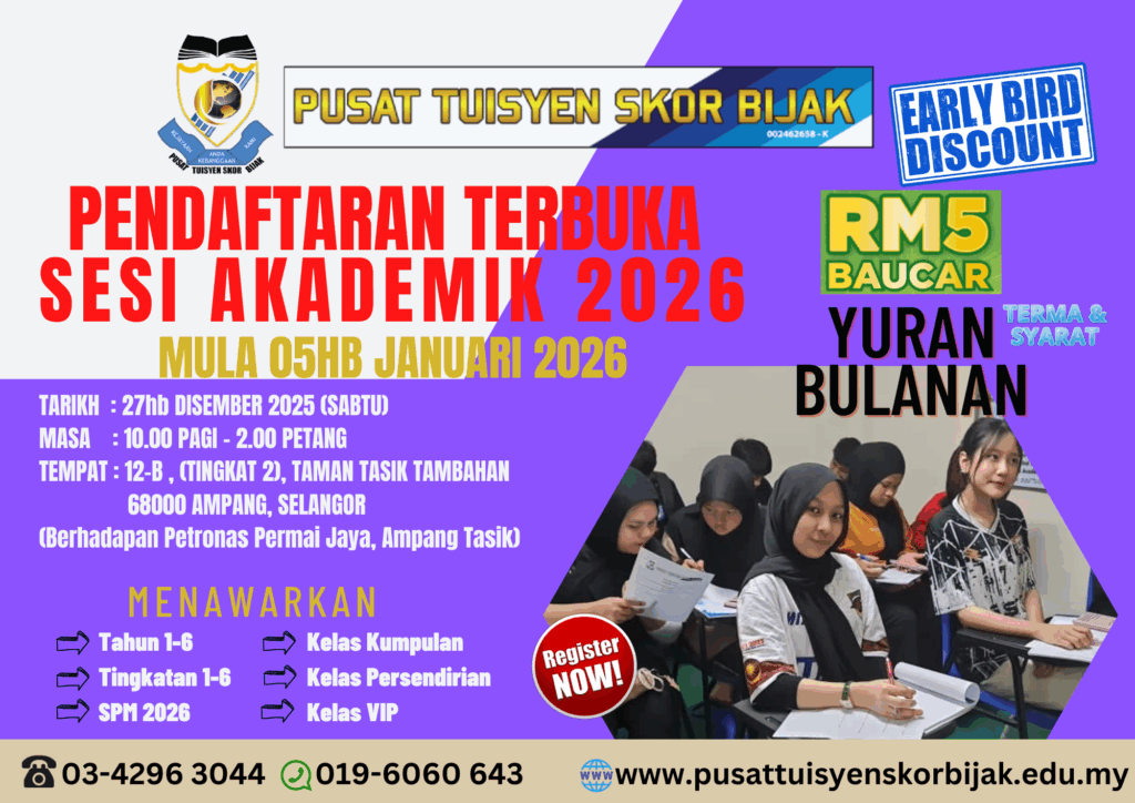 PENDAFTARAN TUISYEN SESI AKADEMIK 2025 SEMPENA CUTI SEKOLAH UNTUK BULAN SEPTEMBER 2025 KINI MASIH DIBUKA !!! PEMBELAJARAN ADALAH SECARA BERSEMUKA UNTUK TAHUN 1-6 DAN TINGKATAN 1-5. (SPM 2025)