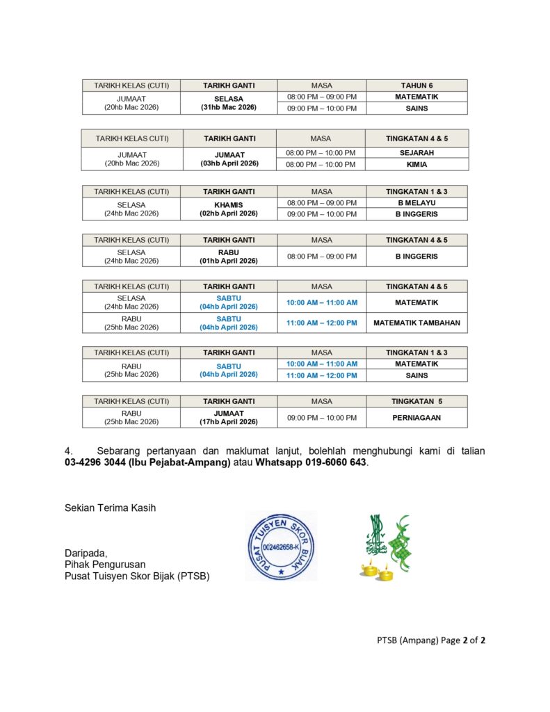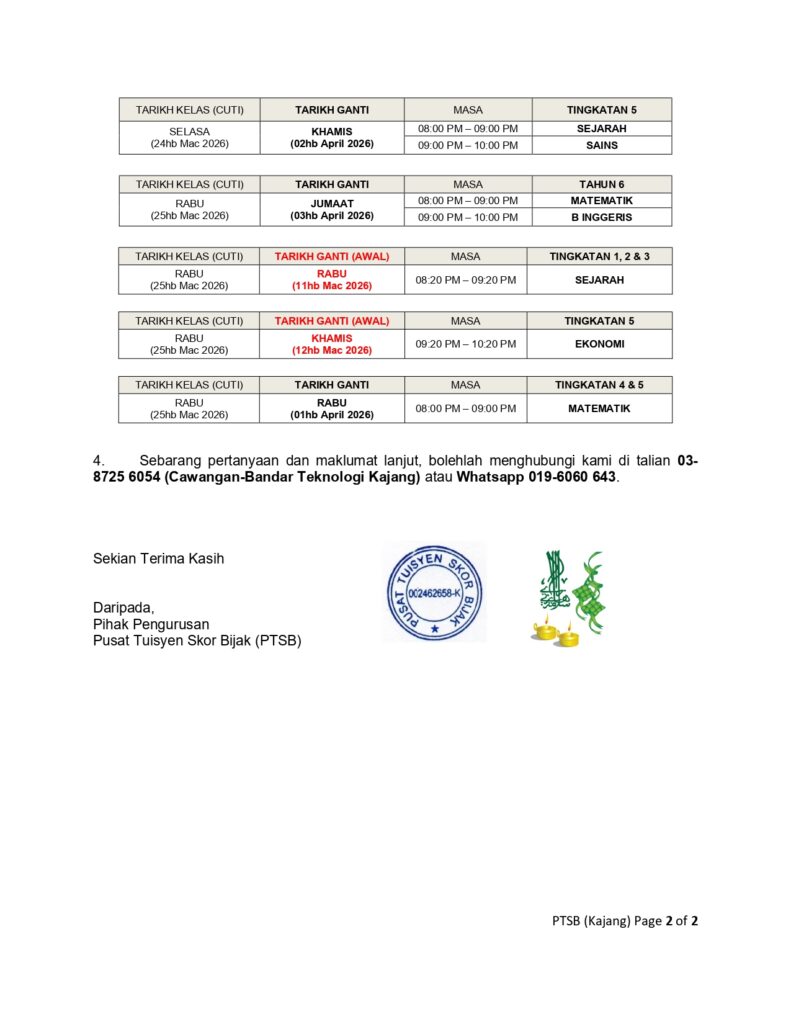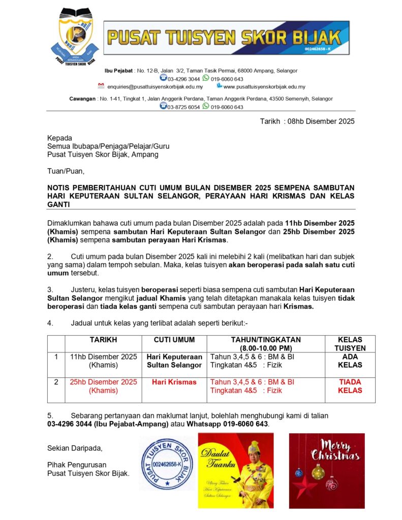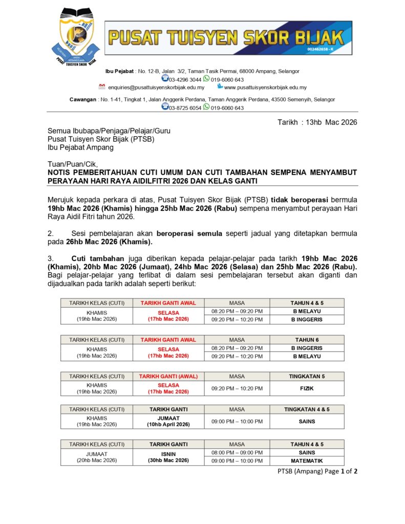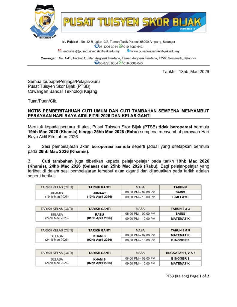 PENDAFTARAN TUISYEN SESI AKADEMIK 2025 SEMPENA CUTI SEKOLAH UNTUK BULAN SEPTEMBER 2025 KINI MASIH DIBUKA !!! PEMBELAJARAN ADALAH SECARA BERSEMUKA UNTUK TAHUN 1-6 DAN TINGKATAN 1-5. (SPM 2025)